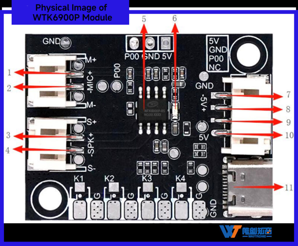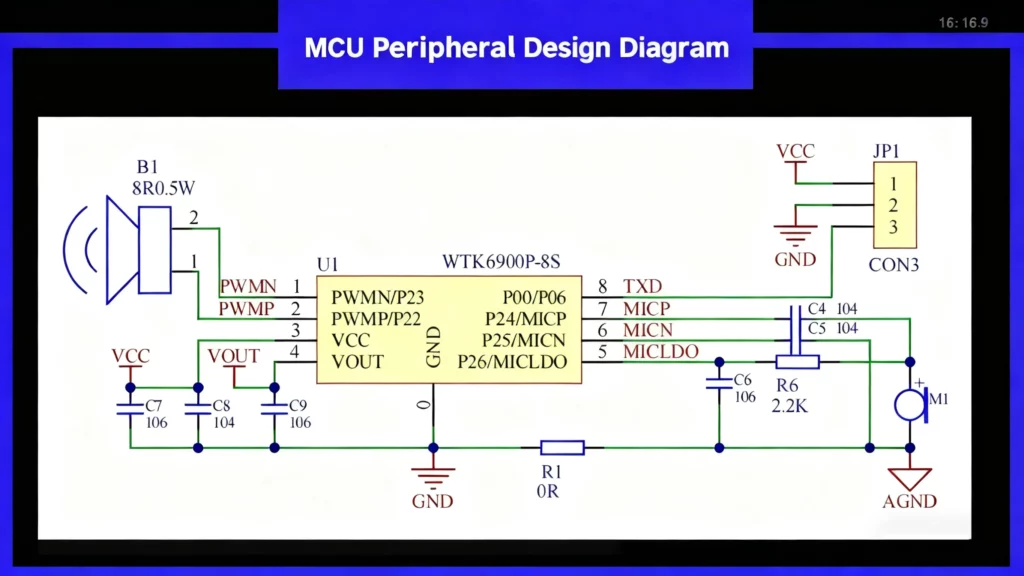 Typical voice interaction solutions may need over 20 external components, while WTK6900P requires fewer than 10. This minimal design cuts material costs, simplifies PCB design, and reduces production complexity—further lowering total cost.